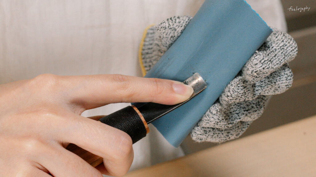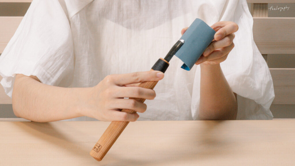 將1000番砂紙放在簡易磨刀木塊的溝槽上。刀刃凹面朝上,貼合木塊中間的凹槽。