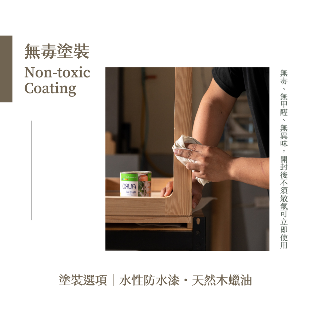 塗裝選用符合兒童家具標準的無毒水性防水漆。