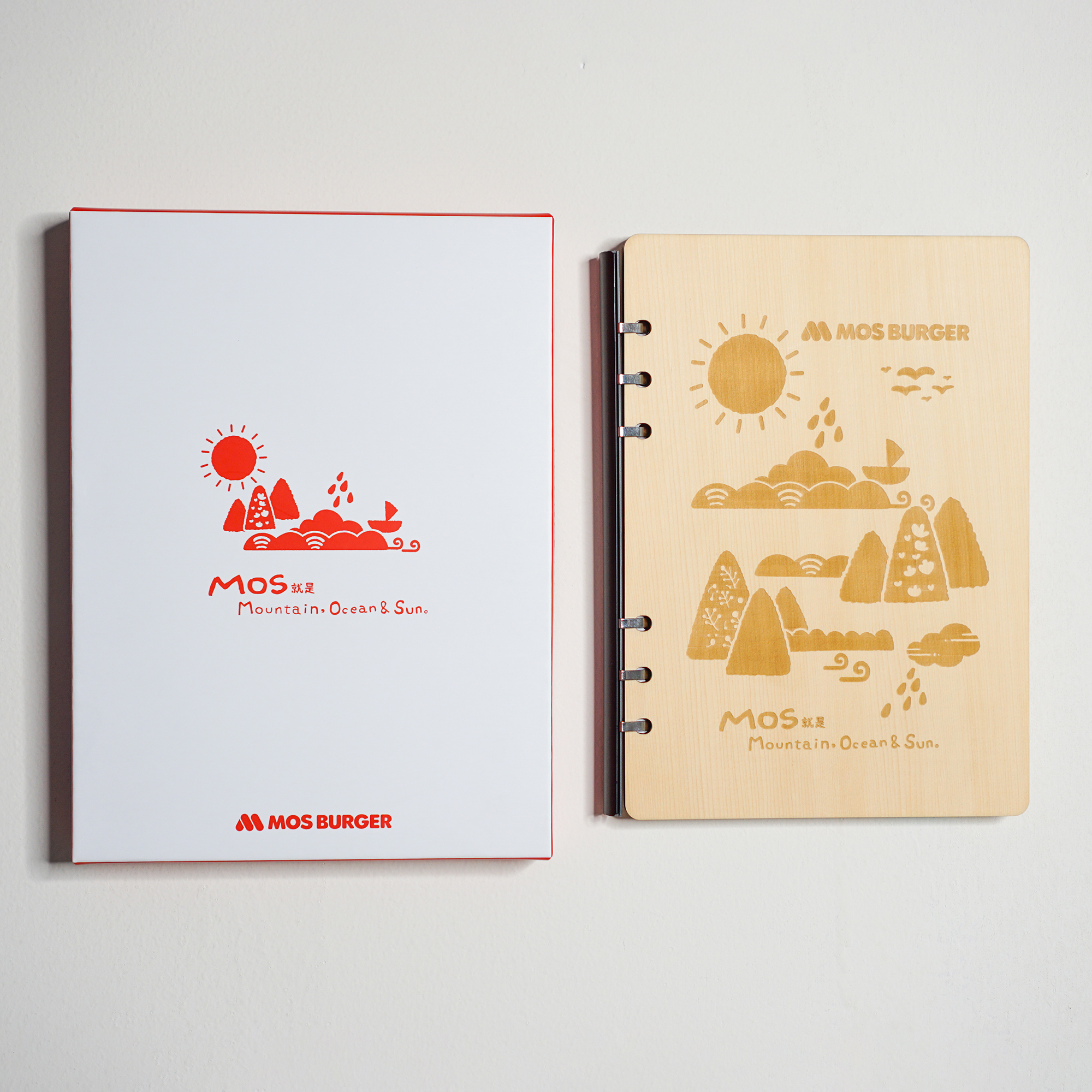 安心食品服務股份有限公司為旗下品牌MOS BURGER 摩斯漢堡,訂製VIP客戶禮品「山海日原木筆記本」。採用AA級加拿大檜木原木薄板為基底,藉由雷射雕刻方式刻在原木薄板手工細緻打磨,讓表面光滑細緻。