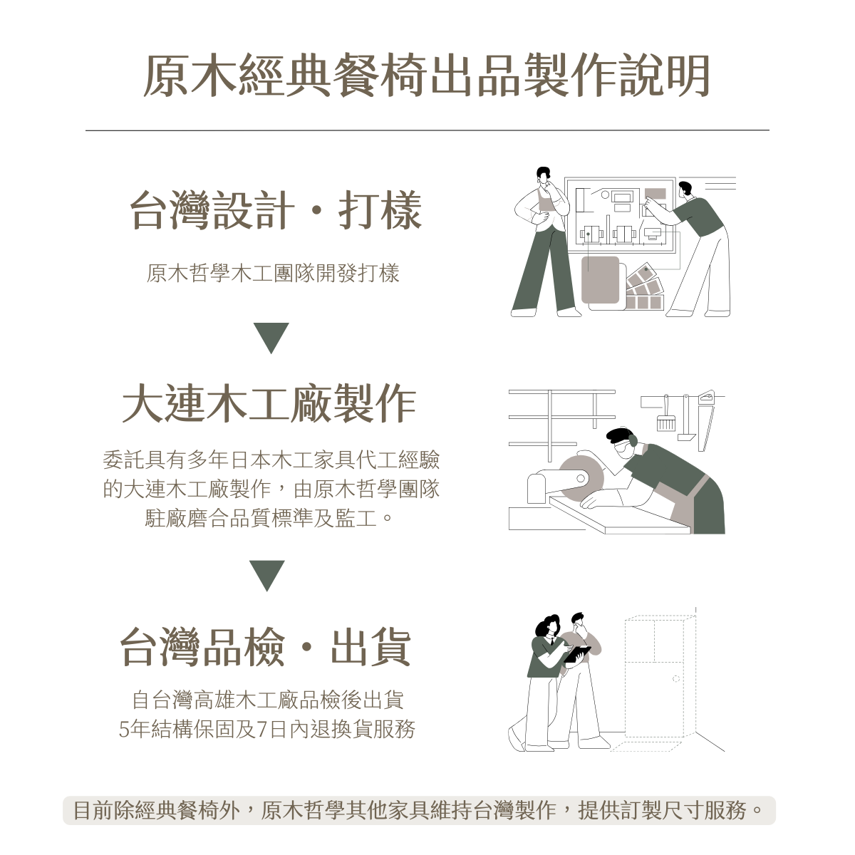 目前除了「原木經典餐椅」外,原木哲學的其他家具皆維持台灣製作。部分品項提供額外加價尺寸訂製服務,詳情請聯繫客服。